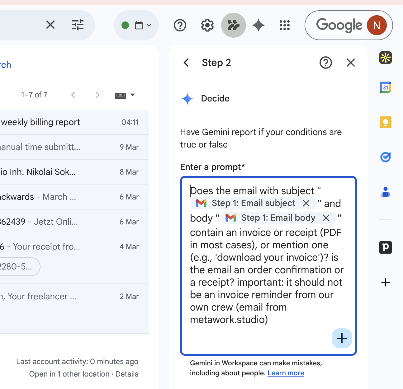 Step 1: let Gemini in Gmail automatically label all emails containing an invoice or a receipt.