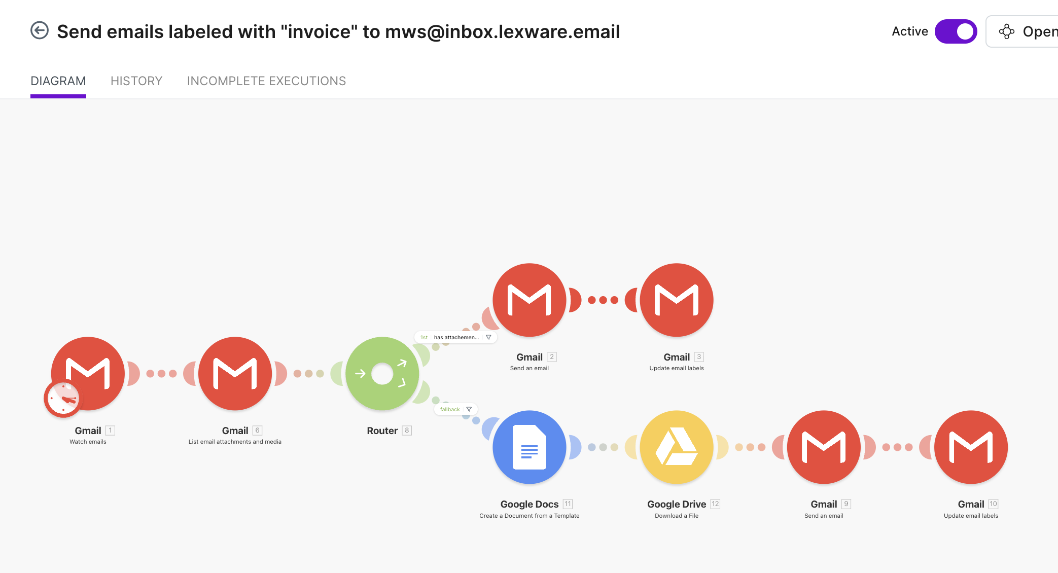 Das war’s. Das Szenario verarbeitet sogar E-Mails, die keine PDF-Dateien sind, und generiert eine. Weil Lexoffice ausdrücklich nur Anhänge akzeptiert und die E-Mail selbst nicht verarbeitet. Fazit: Etwa 30 Minuten weniger manuelles Weiterleiten pro Monat. 6 Stunden Arbeit pro Jahr. So hole ich mir meine Freizeit zurück. Eine kleine Automatisierung nach der anderen.