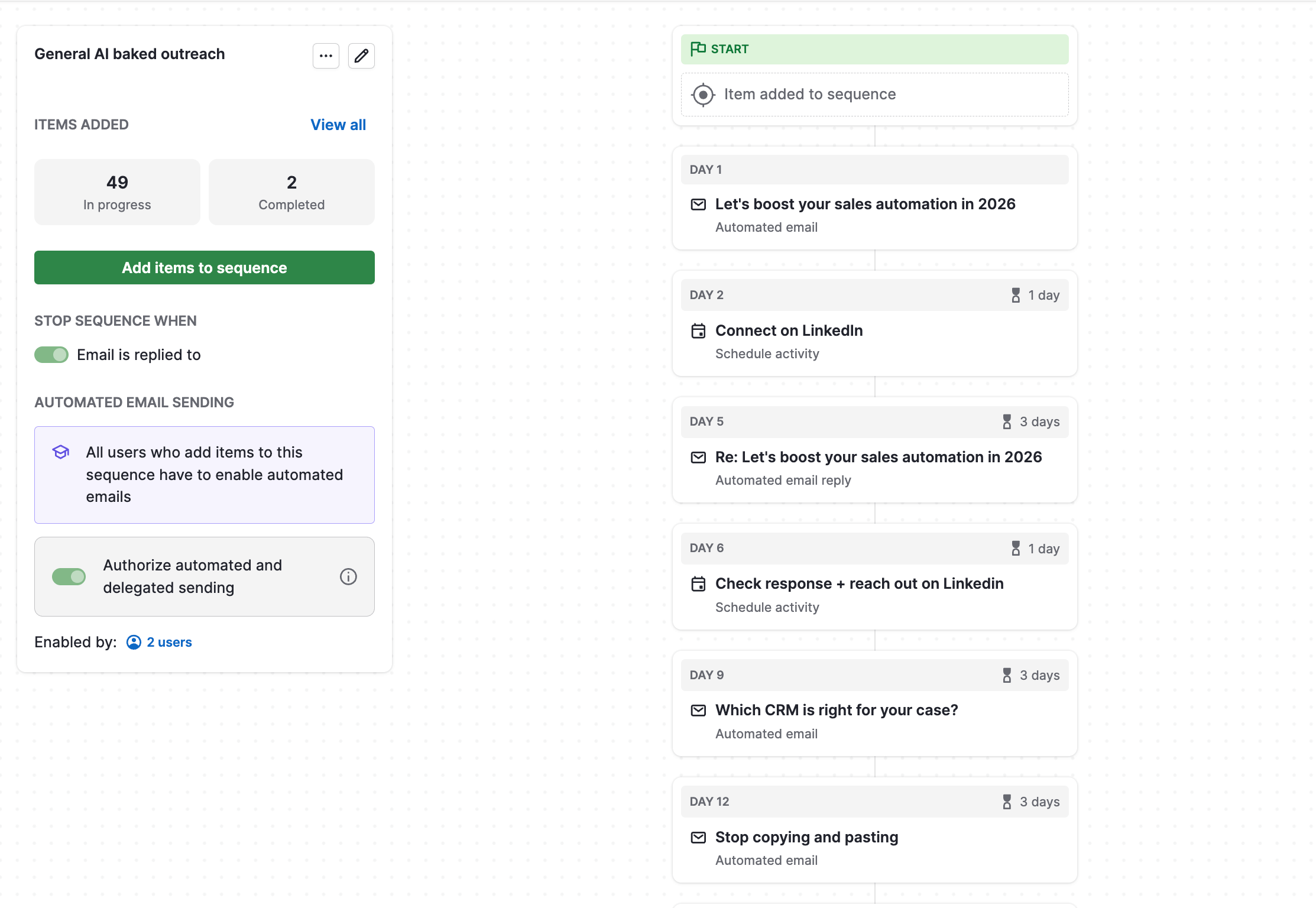 In beiden CRMs gibt es Sequenzen, die sehr ähnlich funktionieren. In HubSpot haben sie mehr “Wums”: mehr Statistiken, mehr Einstellungsmöglichkeiten.