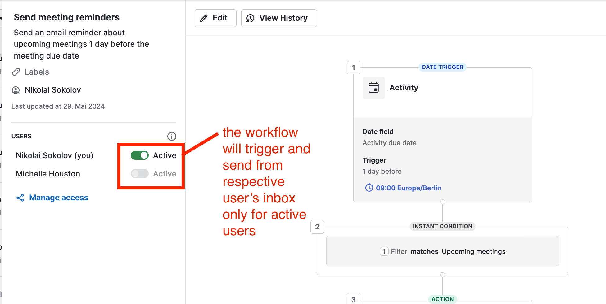 - Wenn du ein Workflow mit Email-Versand aktivierst, wird dein Account verwendet, egal wessen Deals oder Kontakte in den Workflow kommen.