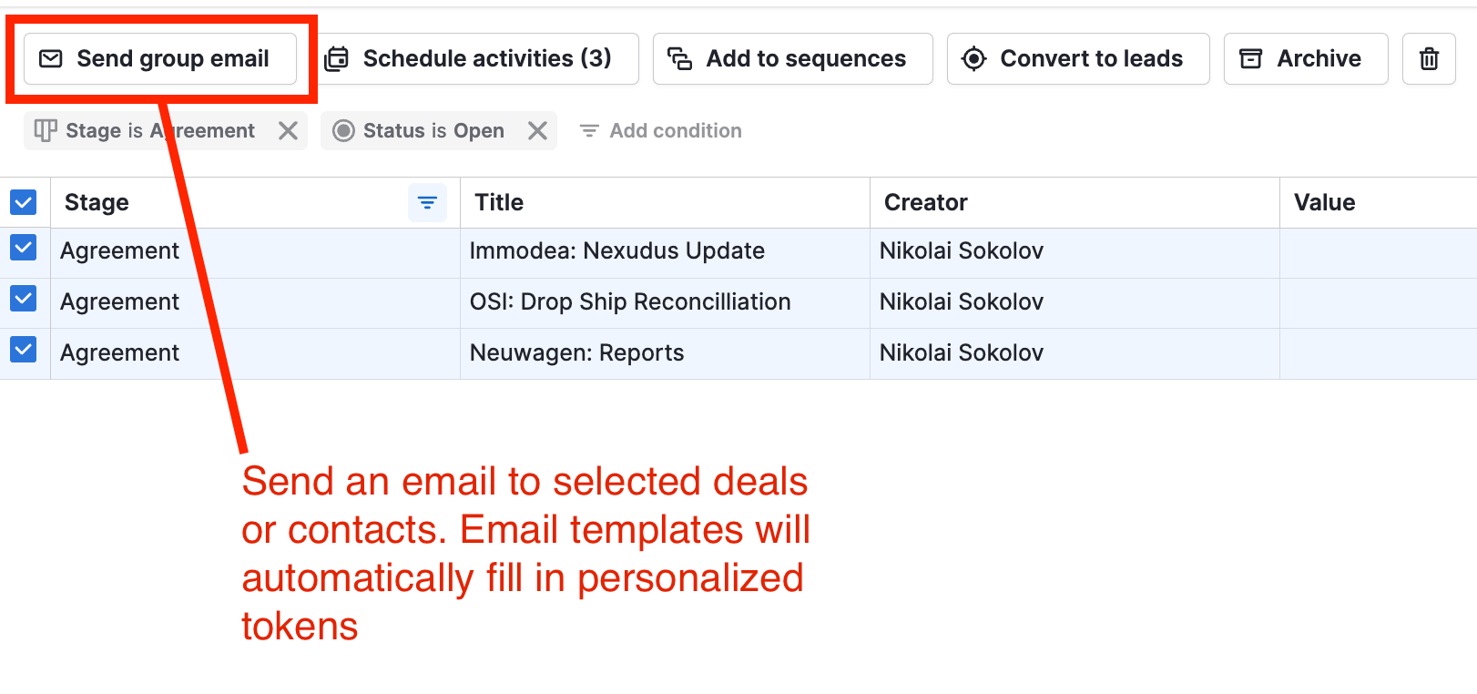 In Pipedrive ist es eine Sache von 3 Klicks, eine Email an 100 Leute zu verschicken. Auswählen > Stapelversand klicken > Prüfen und absenden.