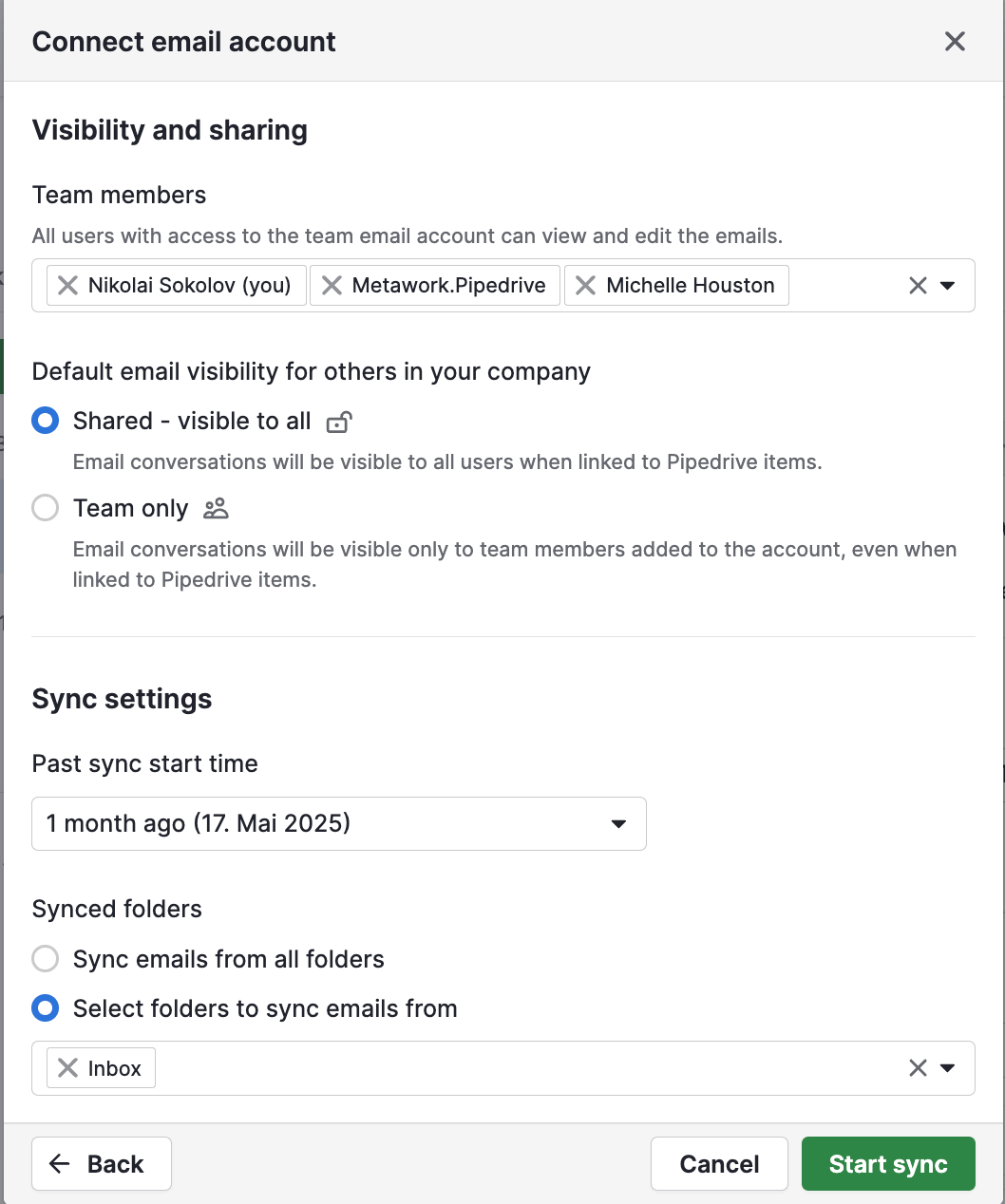 - alle Emails aus deinem Postfach werden standardmäßig als geteilt markiert, damit alle im Team den Inhalt sehen können, wenn sie im Dealverlauf nachschauen.