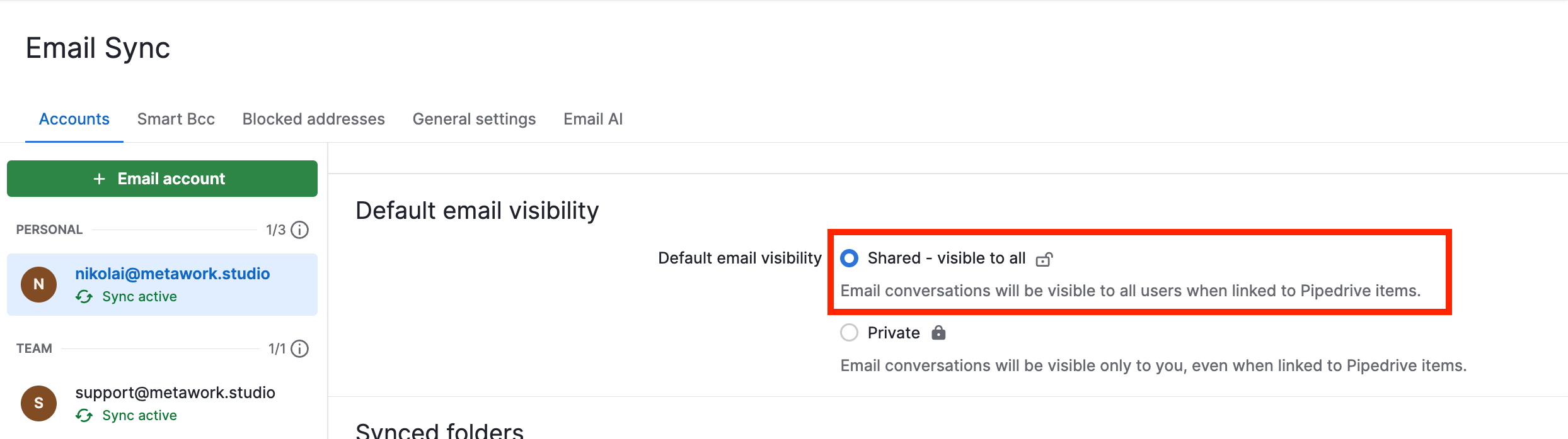 In den Email Sync Einstellungen kannst du die Sichtbarkeit der Emails kontrollieren. Grundsätzlich gibt es 2 Möglichkeiten: