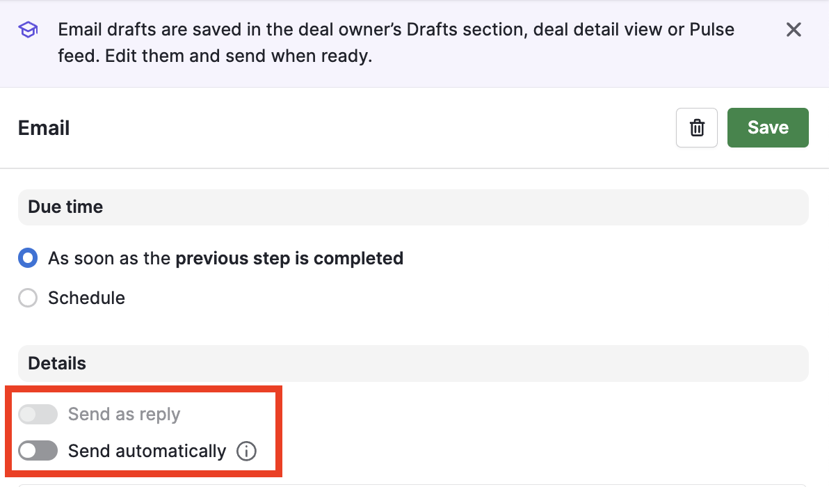 Es ist jetzt möglich, beim Einrichten einer Sequenz zwischen E-Mail-Entwurf und sofortigem Senden zu wählen. Im Entwurfsmodus kann der Benutzer die E-Mail anpassen, bevor er sie versendet. Dies ist manchmal notwendig, um die E-Mail persönlicher oder passender zu gestalten.