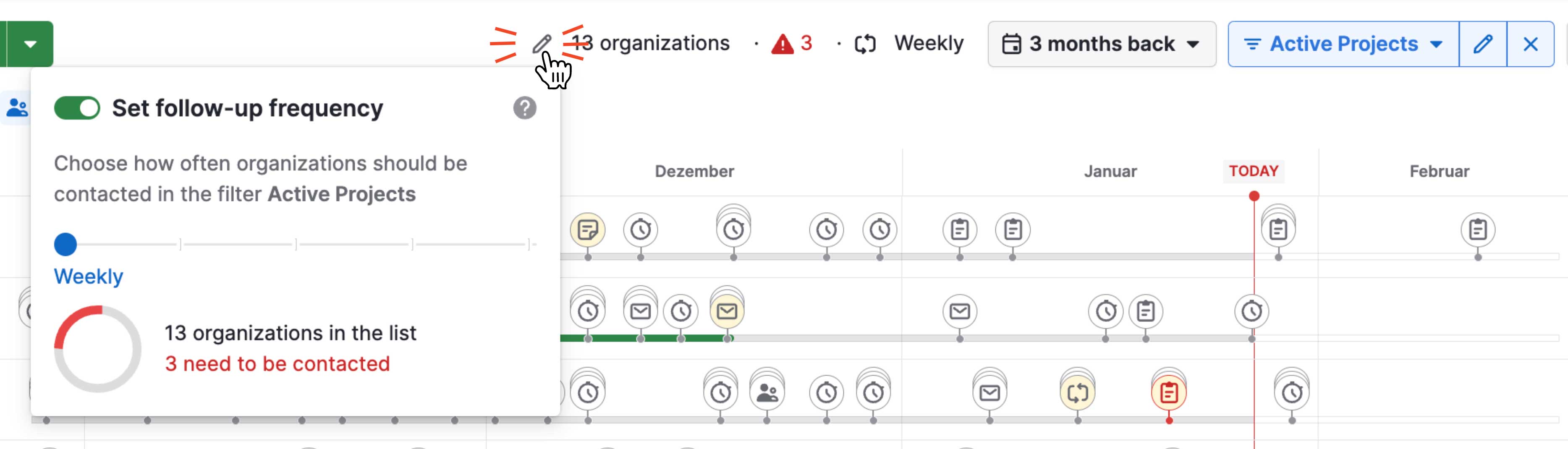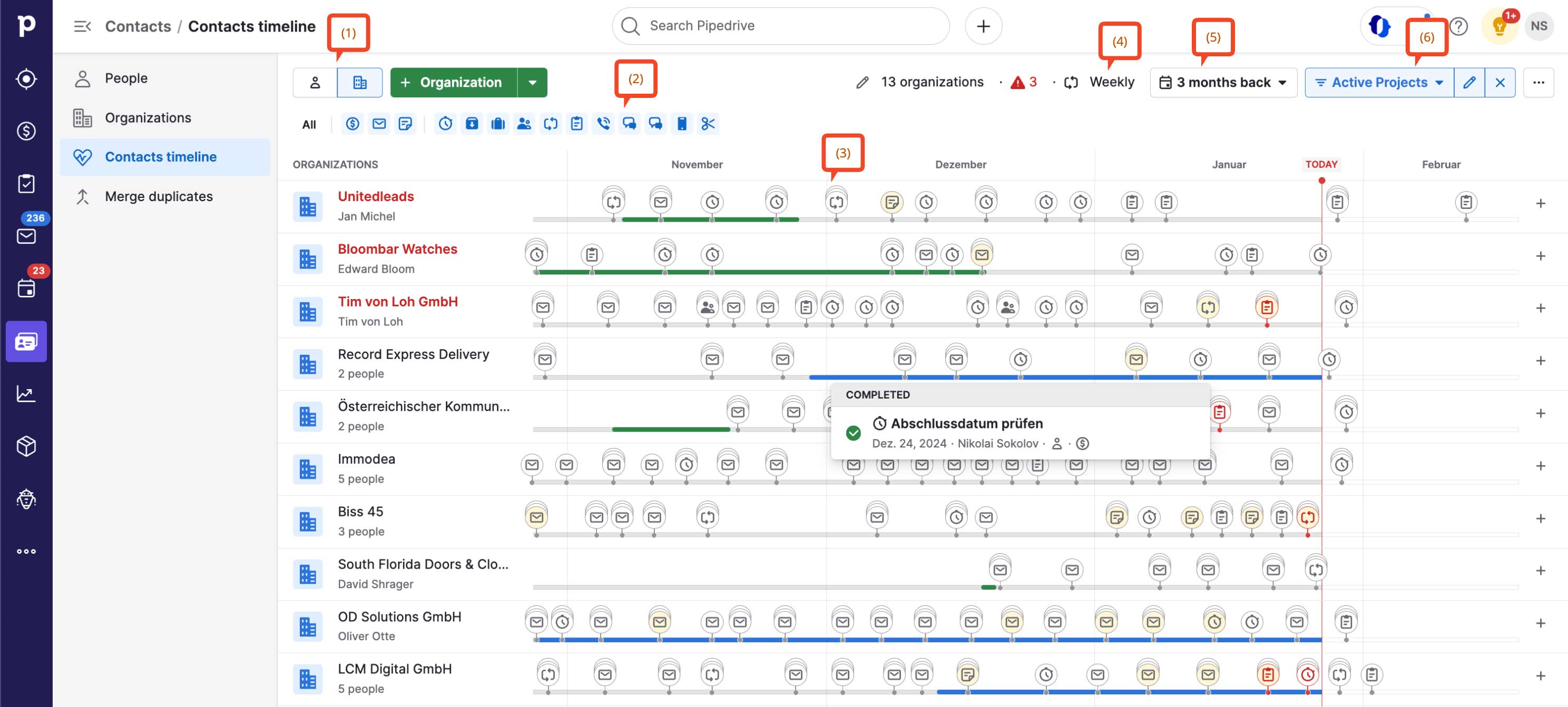 Du kannst angeben, wie oft du sie kontaktieren möchtest (4), wie weit die Timeline zurückreichen soll (5) und wie Kontakte oder Organisationen gefiltert werden sollen (6).