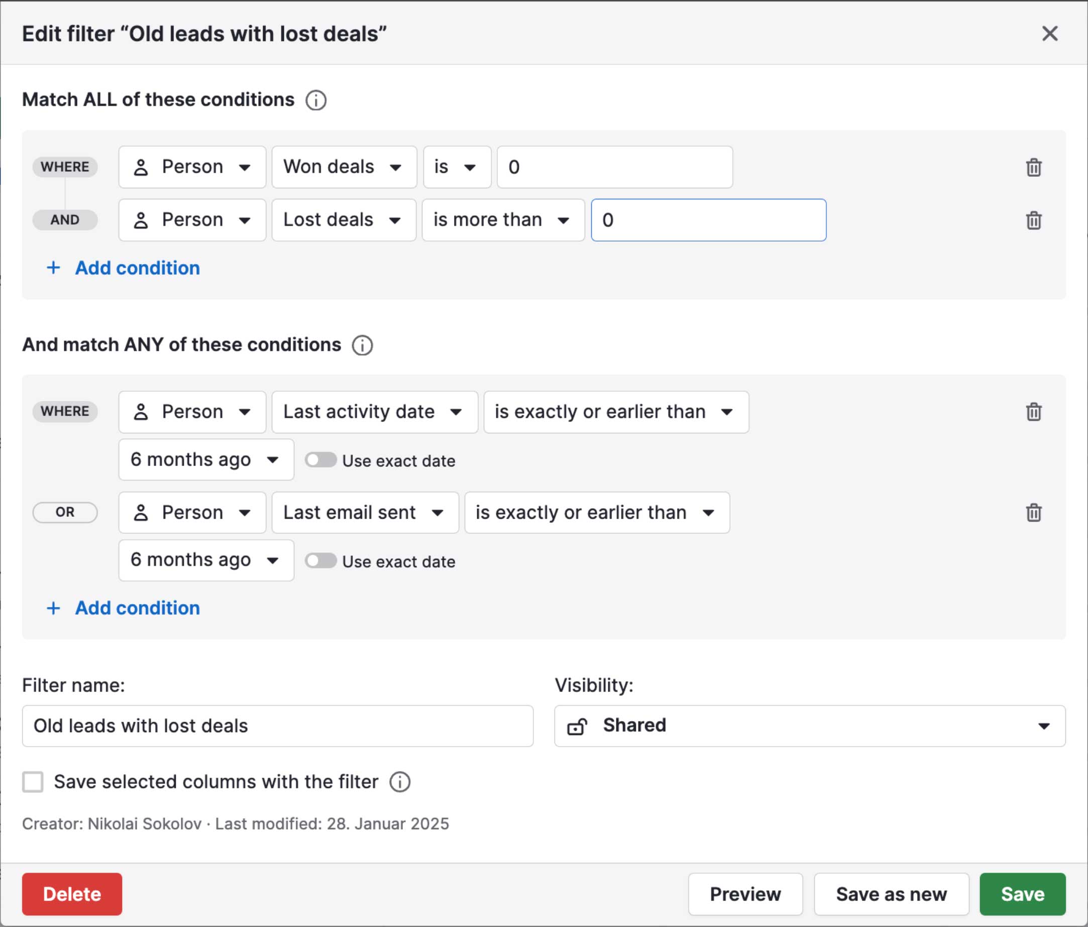 Mit Filtern lässt sich eingrenzen, an welchen Leads man dran bleiben will und welche Angebote oder Projekte Aufmerksamkeit brauchen.
