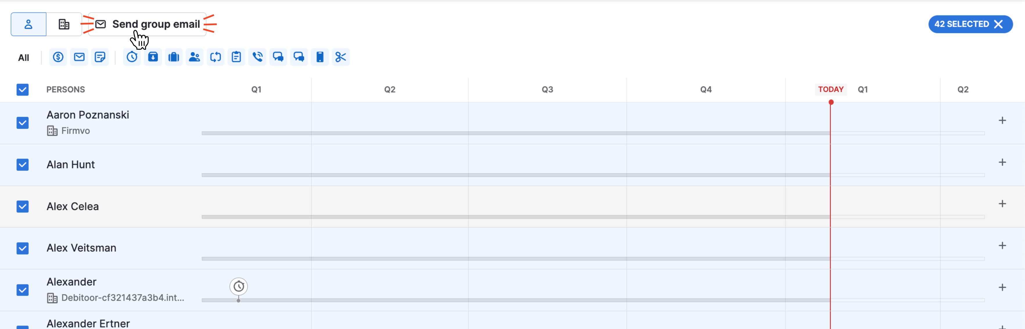 Mit dem Sammelmail-Feature kannst du direkt aus der Timeline eine kleine Email-Kampagne starten und Termine buchen. Dafür die gewünschten Personen auswählen (oder alle auswählen) und den Button für Sammelemail klicken.