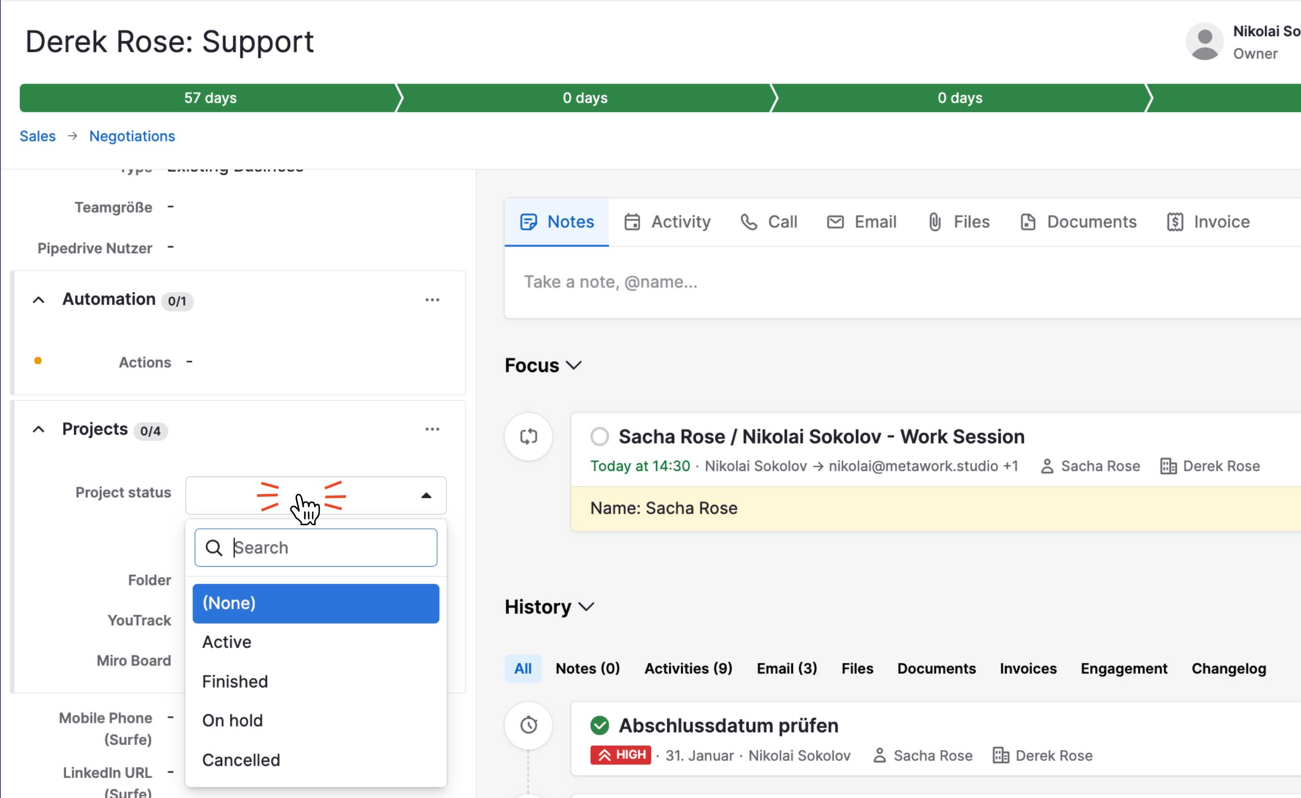 - Ein Workflow, welches bei Abbruch des Projekts das Feld im Deal auf „Abgebrochen“ aktualisiert.