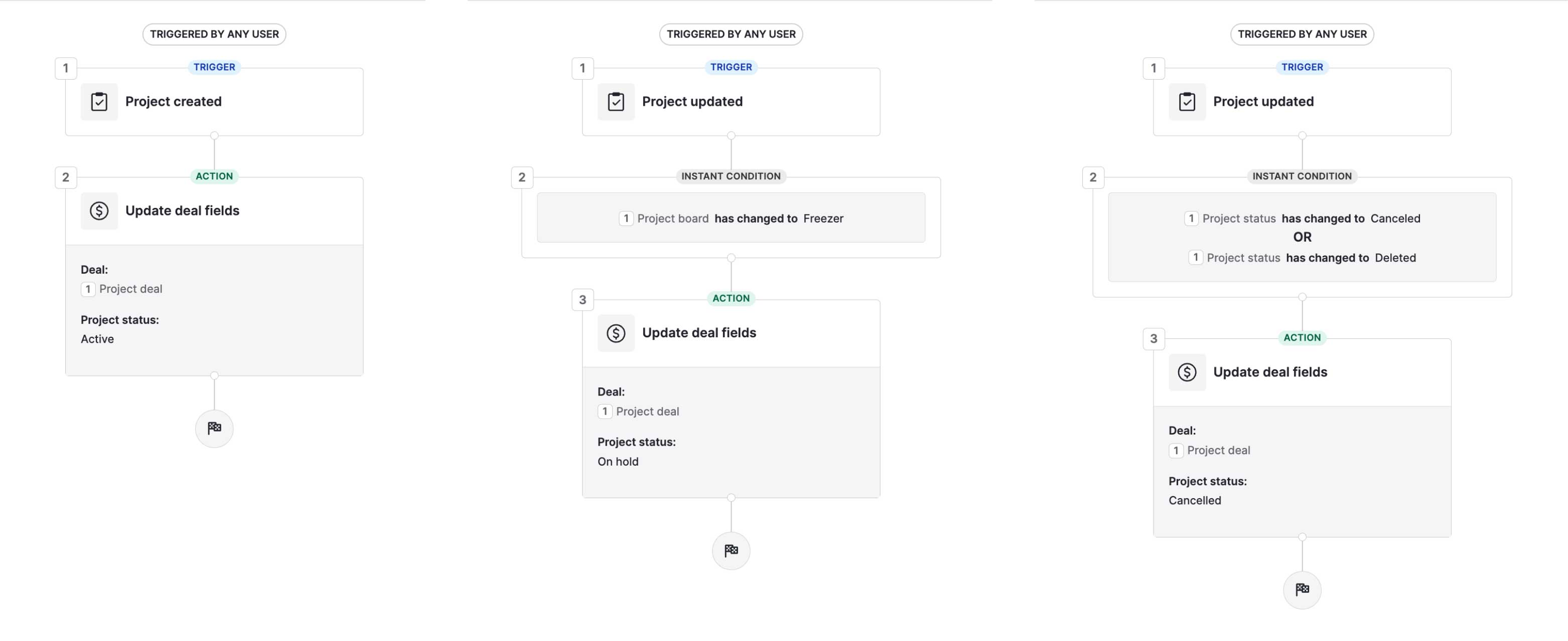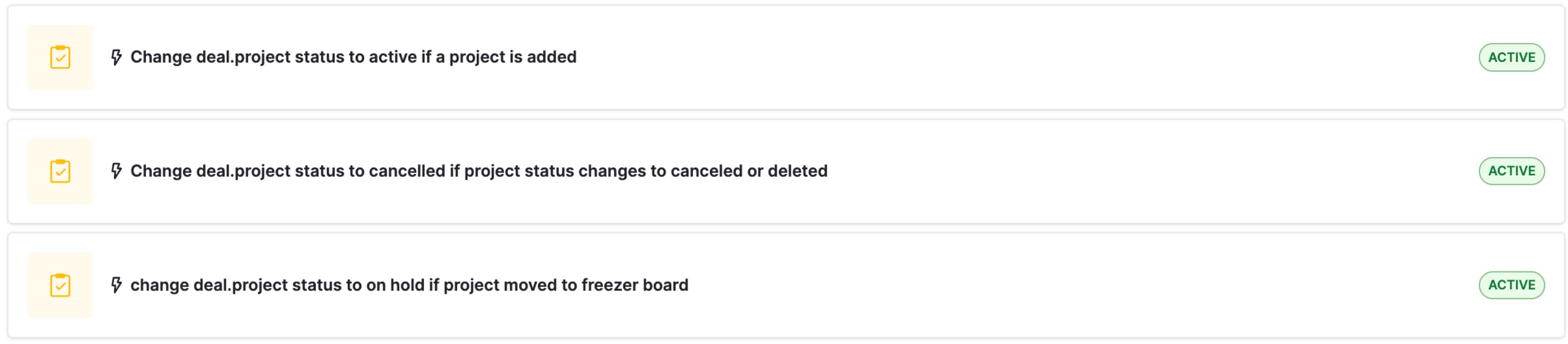 Als Nächstes müssen die projektbezogenen Workflows erstellt werden. Sie sind ziemlich einfach: wenn ein Projekt erstellt wird, setzen wir den Status in Deal auf „läuft“ usw.