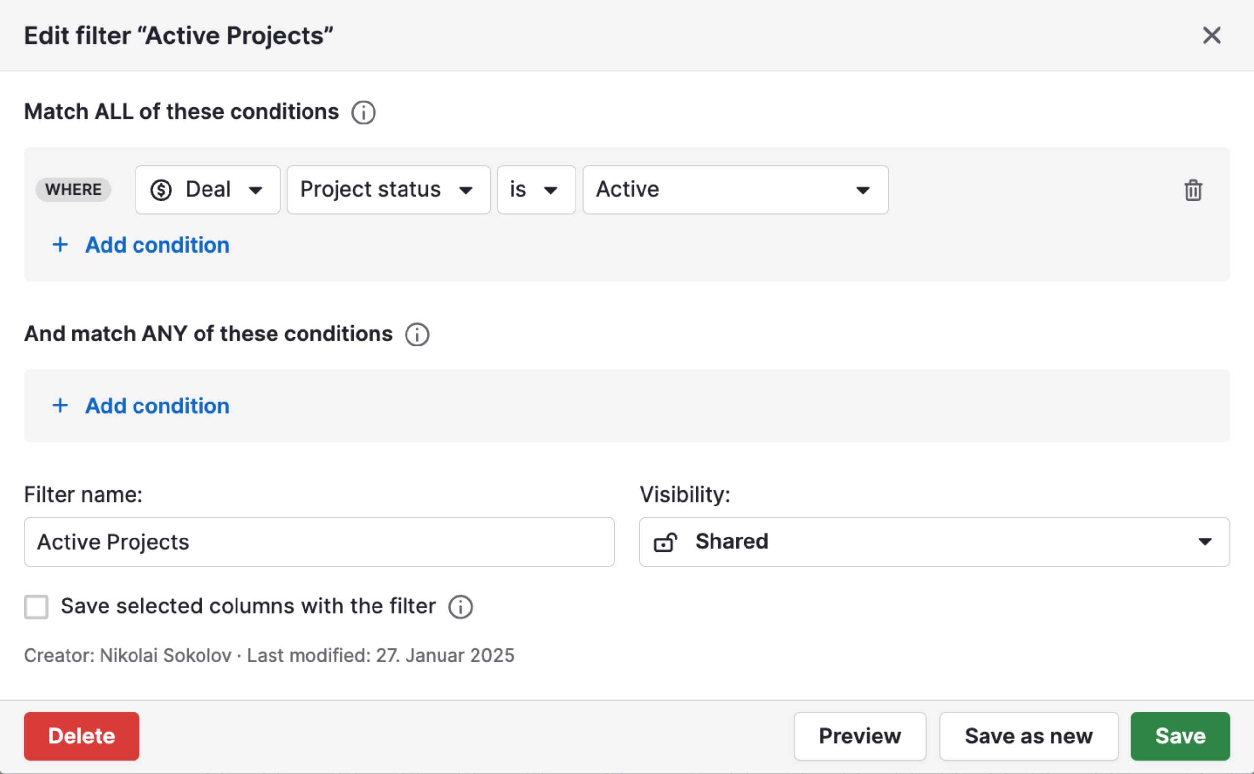 Zum Zeitpunkt dieses Posts gibt es keine Möglichkeit, Projekte in Filtern außerhalb des Projektmoduls zu verwenden. Was genutzt werden kann, ist eine Tracking-Eigenschaft in Deals, welche mit Workflow Automation aktualisiert wird: